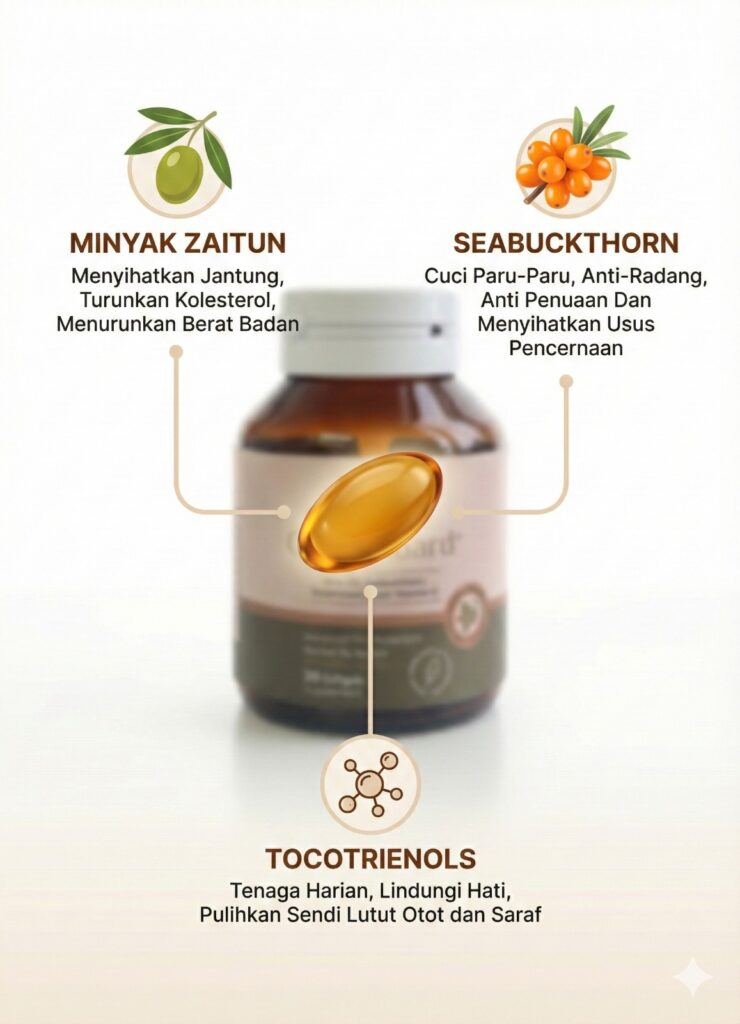 Olive Guard+ formulasi lebih likat berbanding dari olive oil biasa dan juga ada campuran sains iaitu seabuckthorn & tocotrienols . Amalkan 1 softgel Olive Guard setiap pagi sebelum sarapan.