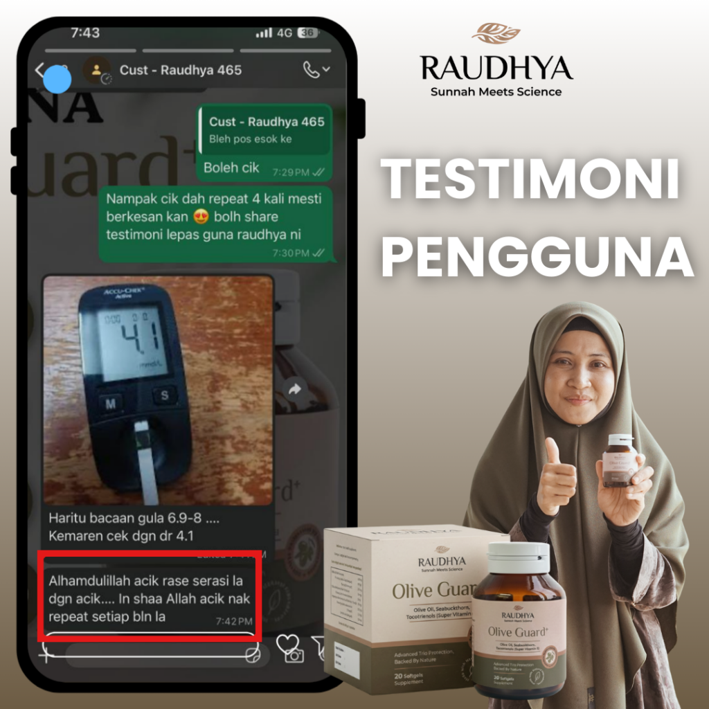 Raudhya OliveGuard+ Diperkaya Bahan Aktif Polyphenols, Tocotrienols (Super Vitamin E) & Omega Aktif Menyokong Kawalan Gula, Kolesterol & Tekanan Darah